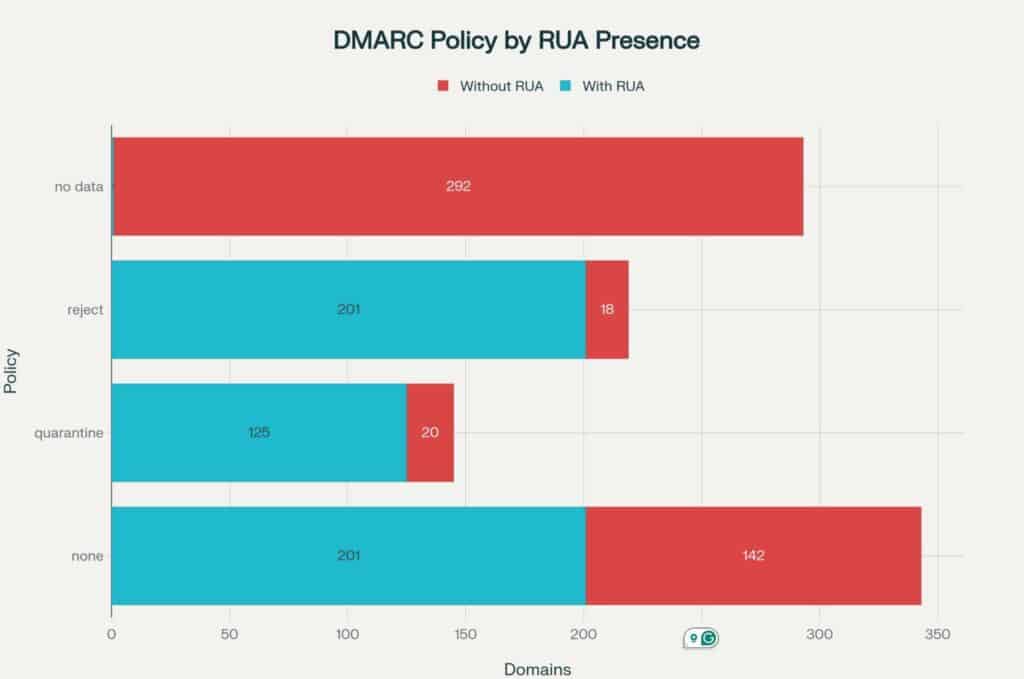כמעט כל הדומיינים שאוכפים ב-reject  או ב-quarantine  מדווחים, אך יותר מ-40% מהמדיניות “none”  אינם מדווחי (רשומת useless).