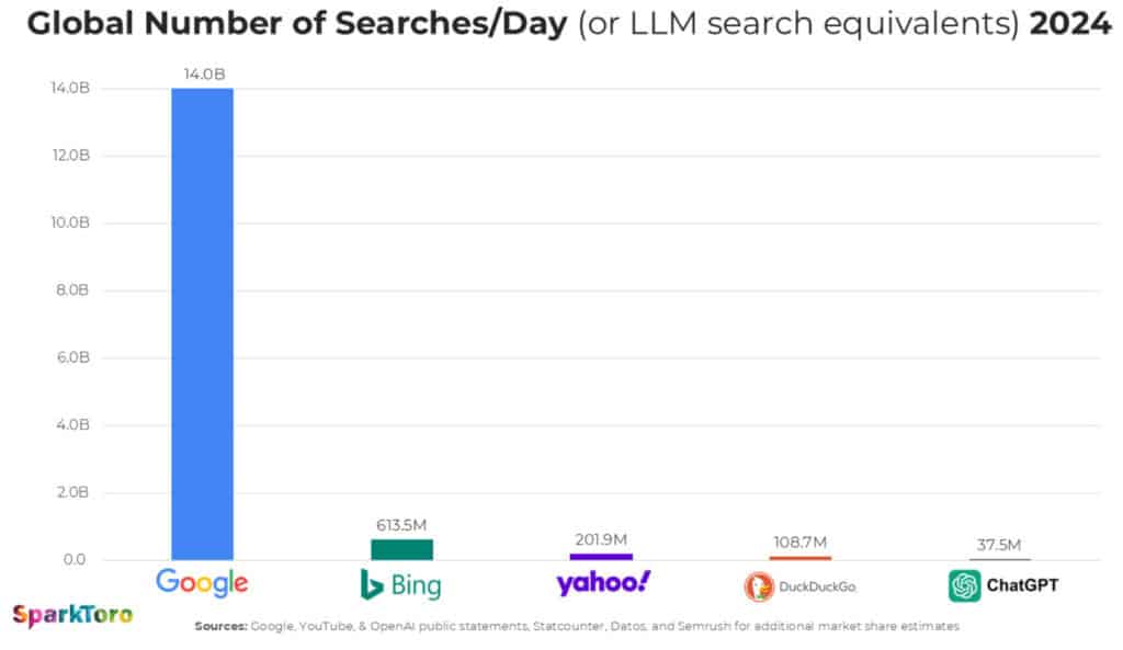 Google search in 2024 vs. search on other engines and ChatGPT. From a study by SparkToro. Click to source