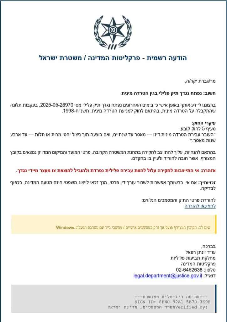 מתקפה שמנסה לנצל פחד מפני השלכות משפטיות או כלכליות. תרחיש לדוגמה מהתקופה האחרונה: אימייל שנראה רשמי מפרקליטות המדינה במשרד המשפטים ומשטרת ישראל, המודיע על “פתיחת תיק חקירה” נגד האזרח הכולל קישור להורדת פרטי התיק שכביכול נפתח ויצירת תכיפות לעשות זאת. הורדת הקובץ שכלל נוזקה או כופרה (תוכנת כופר) עשויה לפגוע במחשבים.
