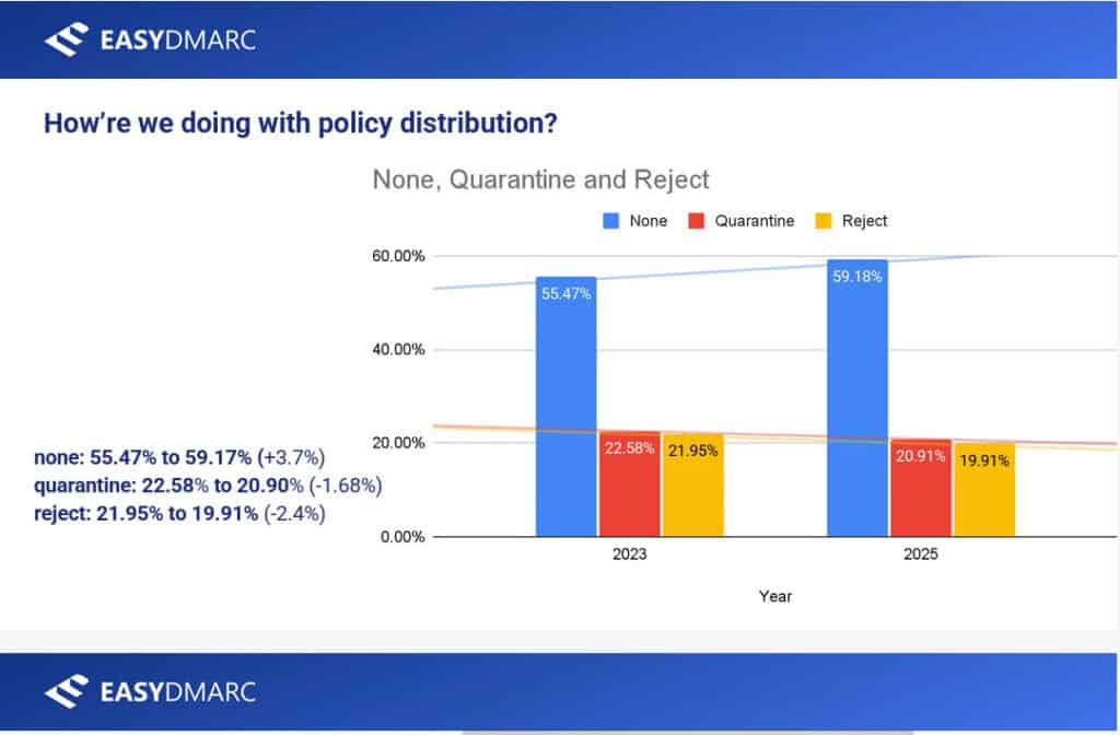 אמנם חלה עלייה בכמות הדומיינים שהיגירו רשומת DMARC תקינה, הרבה מזה הודות לדרישות החדשות של ספקיות האימייל הגדולות  שנכנסו לתוקף ב-2024, אך לפי EasyDMARC שמטמיעה ומנטרת DMARC, חלה ירידה בכמות הדומיינים שעברו למצב אכיפה. רק במצב אכיפה יש הגנה על הדומיין ואפשר לזכות ב”נקודות עבירוּת” (ספקיות האימייל מבצעות פחות בדיקות).